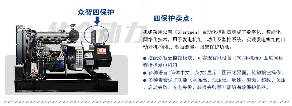 機(jī)組采用眾智(Smartgen)自動(dòng)化控制器集成了數(shù)字化、智能化、網(wǎng)絡(luò)化技術(shù),用于發(fā)電機(jī)組自動(dòng)化及監(jiān)控系統(tǒng),實(shí)現(xiàn)發(fā)電機(jī)組的自動(dòng)開機(jī)/停機(jī)、數(shù)據(jù)測(cè)量、報(bào)警保護(hù)功能。
